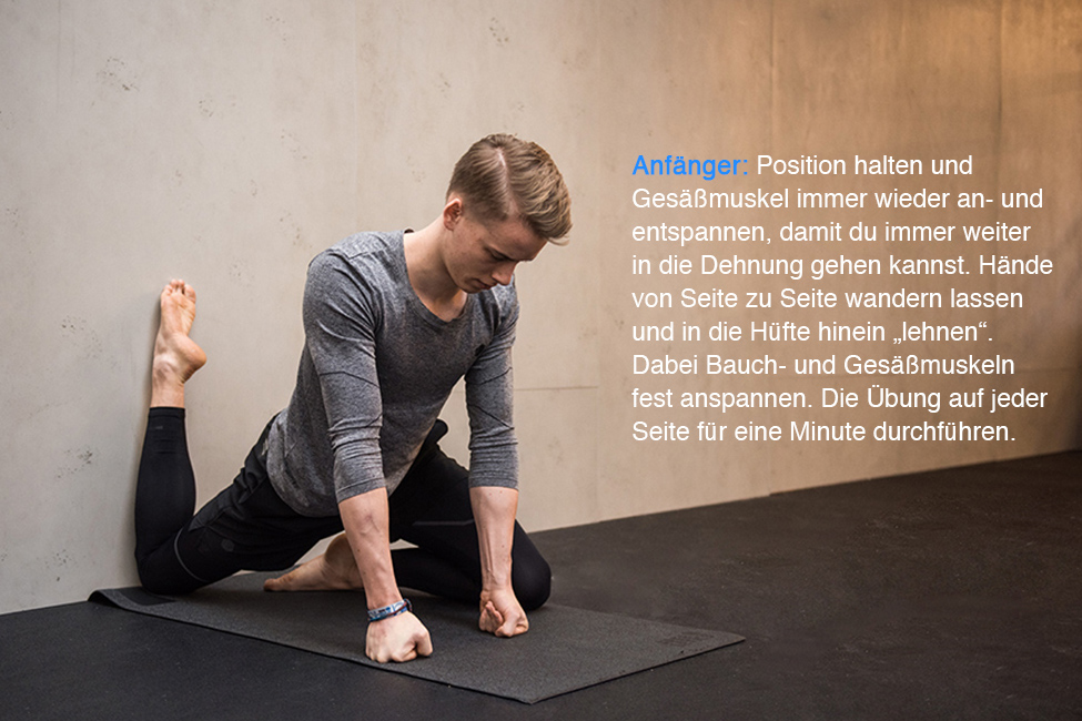- Aus dem Stand ein Bein nach vorne bringen und den ganzen Fuß flach auf dem Boden aufstellen. Das andere Bein nach unten bringen, bis Knie und Fuß ebenfalls den Boden berühren. Rücken und Hüfte in neutraler Position halten. Die Hände auf dem Boden absetzen um den Oberkörper abzustützen. Nun die Hüfte Richtung Boden bewegen, um die Dehnung zu intensivieren.