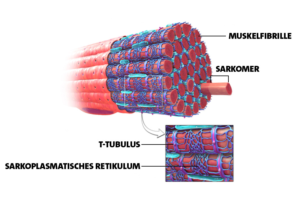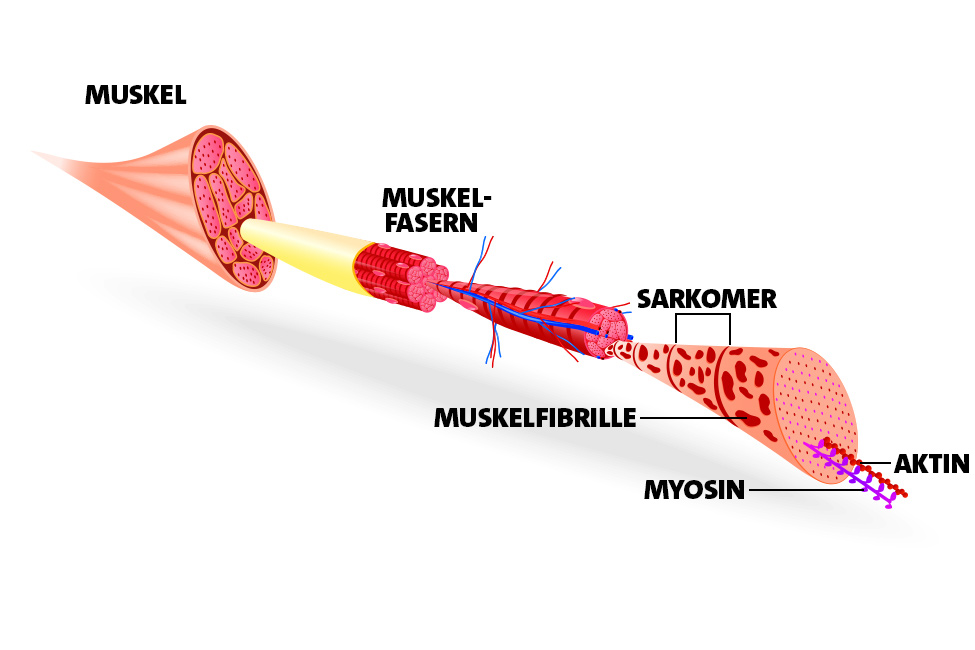 Ein Skelettmuskel besteht aus mehreren Muskelfaserbündeln. Jede Muskelfaser besteht aus mehreren Muskelfibrillen, die wiederum aus Funktionseinheiten bestehen, die Sarkomere genannt werden. Schaut man sich ein Sarkomer genauer an, sieht man, dass es aus dünnen und dicken Fäden besteht. Der dickere Faden nennt sich Myosin und ist mit dem Zentrum des Sarkomers verbunden. Der dünnere Faden wird Aktin genannt und ist mit dem Rand des Sarkomers verbunden. Im Grunde gleiten sie hintereinander, um das Sarkomer und damit den gesamten Muskel zu verkürzen.