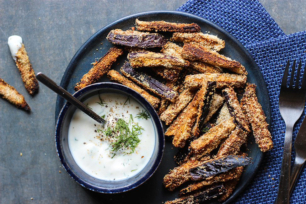 Crunchy aubergine strips coated in almond meal taste just like fries, but without all the extra calories. With a crisp outside and a tender interior, these little guys pair perfectly with a creamy lemon dill dip.