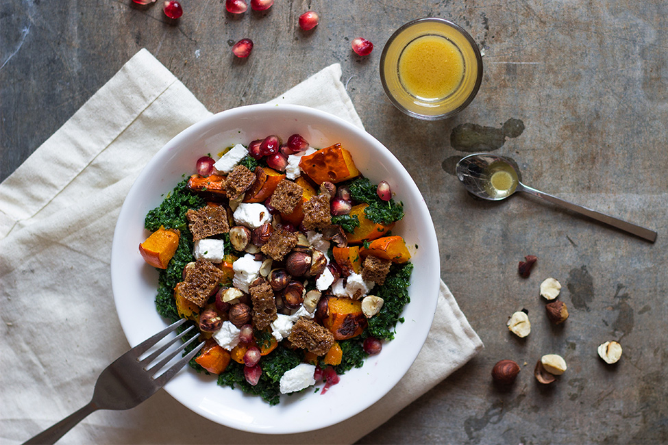 “Have you ever tried a combination of cold, warm, sweet and spicy all at the same time? With this meal, you experience a little bit of everything. It’s my favourite post-workout snack: Warm pumpkin, kale and goat cheese – yum.”