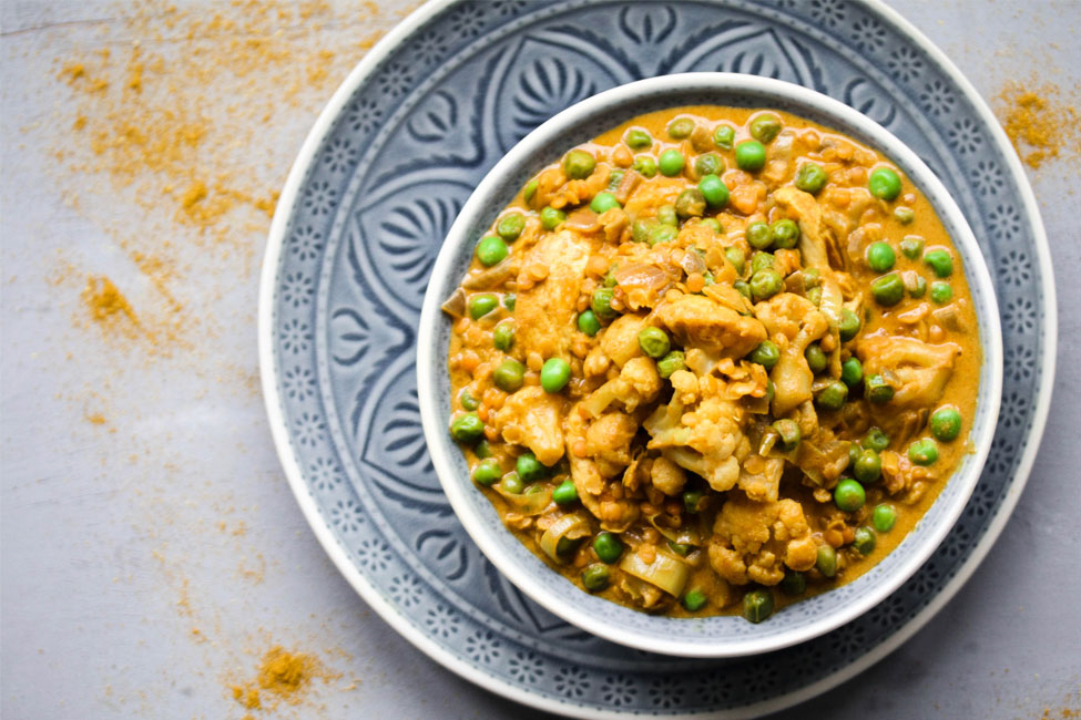 - Heat coconut oil in a pot. Over medium heat, stir-fry chicken and onion for approx. 5 minutes. Add cauliflower, lentils, leek, peas, curry powder and cayenne pepper and stir-fry for another 2 minutes.