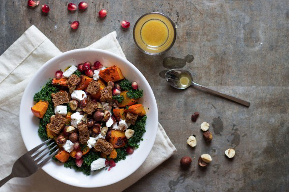 Baked Pumpkin On Kale With Bread Chips for dinner