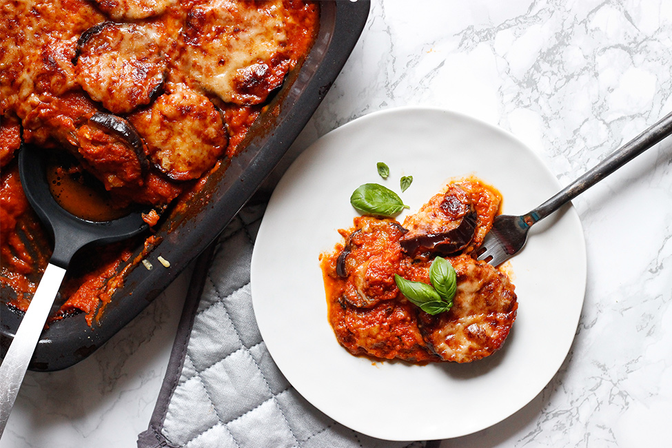 Aunque pueda sonar saludable, las berenjenas a la parmesana pueden ser a menudo una bomba calórica. Por esa razón hemos dado a este plato un cambio de imagen saludable, diciendo adiós al rebozado, a la fritura y creando nuestra salsa saludable. ¿El resultado? Una nueva y mejorada receta cargada de antioxidantes y con sabores frescos de la granja.