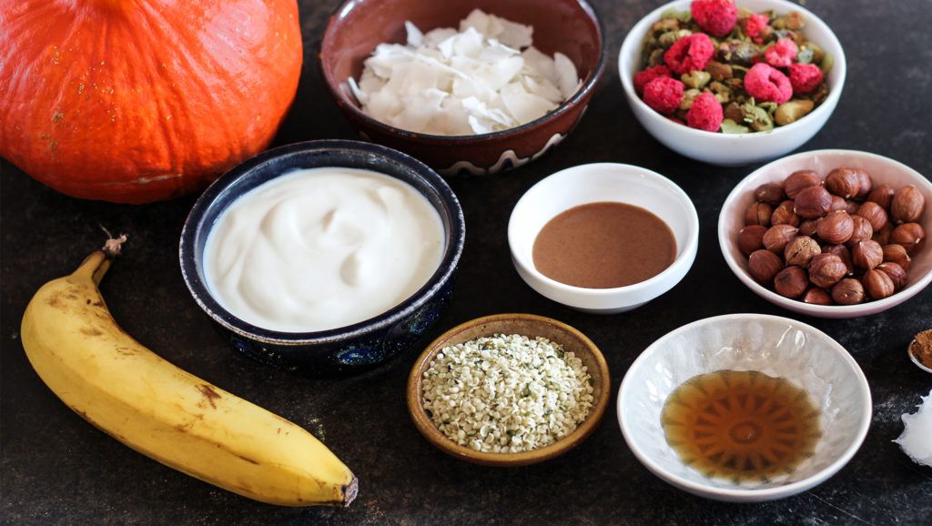 - Sacar la calabaza del horno y rellenarla con los ingredientes, tal y como harías con un cuenco de desayuno normal: echar el yogurt de soja, añadir el banano troceado, la mantequilla de avellanas, el sirope de arce y echar por encima las avellanas, las semillas de cáñamo y los copos de coco tostados.