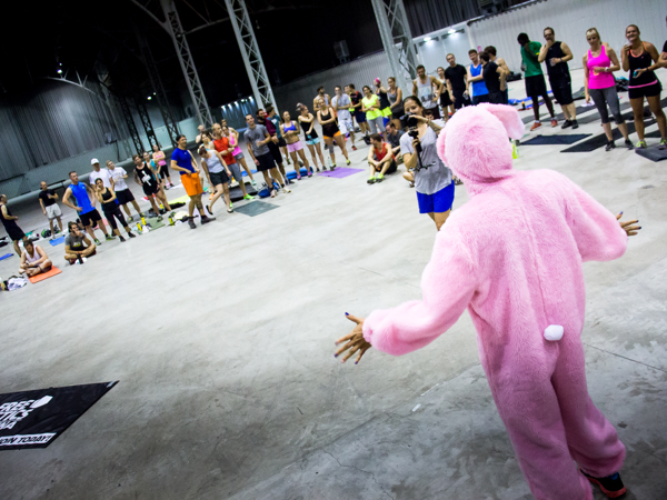 Para participar en la lotería, había que participar en el Reto Freeletics (y lo hizo todo el mundo, claro). Cada grupo estaba formado por entre 20 y 25 personas aproximadamente. La idea era hacer una especie de entrenamiento en circuito. Cada parada tenía 2 Atletas avanzados para garantizar que se hacían las repeticiones adecuadamente, y para responder a cualquier pregunta. El objetivo era comenzar cuando sonara la música y hacer repeticiones perfectas justo hasta que la música se detuviera. Después, iban a la próxima parada del circuito, donde había que hacer lo mismo pero con otro ejercicio. Todo el mundo tenía 45 segundos para cambiar de parada, nada fácil con un grupo de 150 personas. Los ejercicios eran: Burpees, Squats, Pushups y Situps. También había un grupo para principiantes para poder explicarles la técnica más detenidamente. Una vez se habían visitado todas las paradas, había terminado el circuito. Hicimos un descanso breve, que aprovechamos para repartir los bien merecidos boletos para la lotería. Después, comenzamos la lotería directamente con nuestra mascota, el “conejito de la lotería”, quien hizo un gran trabajo. Tras un largo aplauso, finalizó la parte oficial y los Atletas empezaron a hacer sus propios workouts. Con toda la energía y adrenalina reunida, se lograron muchos PB ese día.