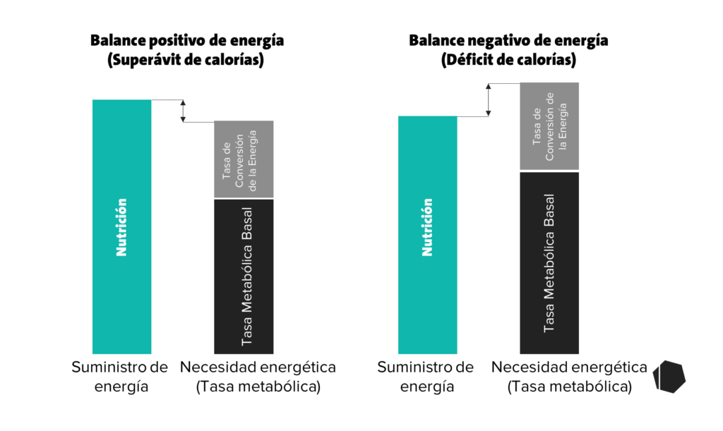 Sencillamente, si tu ingesta diaria de calorías es mayor que tu necesidad diaria de energía, hay un balance positivo de energía, y ganas peso. El exceso de energía se almacena en el cuerpo, principalmente en forma de grasa. Sin embargo, si tu ingesta diaria de energía es menor que tus necesidades diarias de energía, se produce un balance negativo de energía, y pierdes peso. El déficit resultante de calorías se equilibra gracias a que el cuerpo toma energía de la grasa acumulada, músculos u otros depósitos de energía.