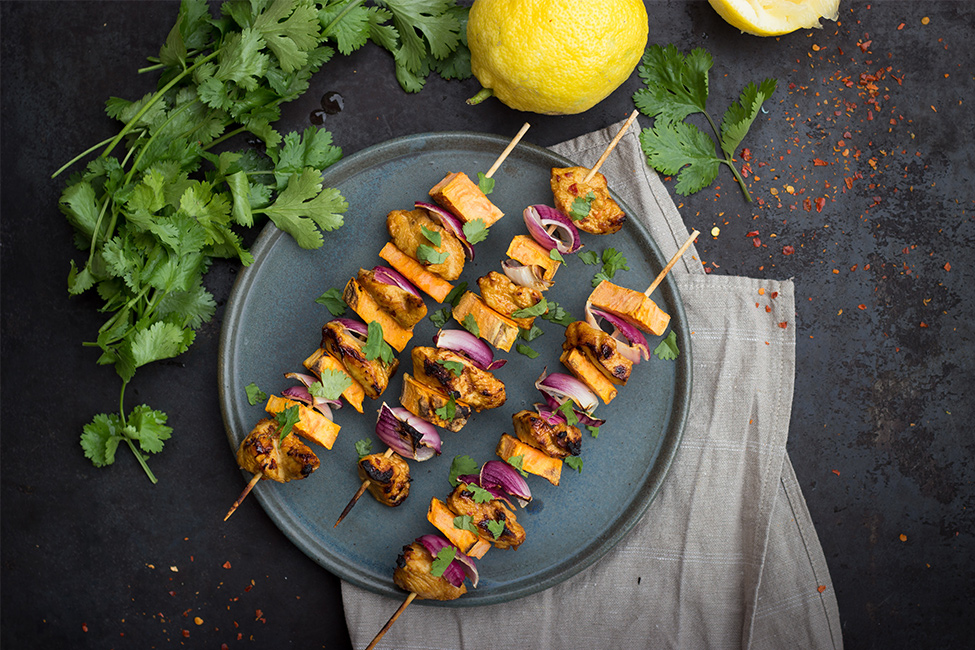 Profitez des saveurs fruitées de l’été avec ces brochettes de patates douces à la fois relevées et grillées à la perfection. Remplacez le poulet par du tofu si vous voulez les savourer sans viande.