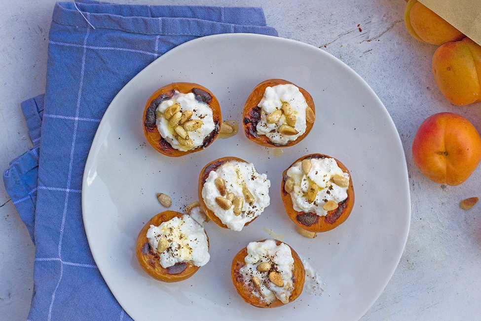 - Remplir les moitiés d’abricot uniformément avec le fromage blanc et les noix de pin, et y verser un filet de miel. Les faire griller au barbecue, face arrondie vers le bas, pendant encore 5 minutes. Assaisonner avec de la vanille fraîche si désiré.