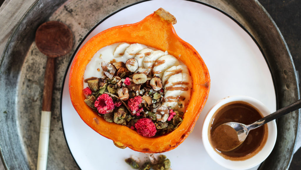 - Sortir le potiron du four et le garnir avec les ingrédients, comme s’il s’agissait d’un bol ordinaire : incorporer le yaourt au soja et la banane coupée en morceaux, napper de beurre de noisettes et de sirop d’érable, et recouvrir le tout avec le mélange grillé de noisettes, de graines de chanvre et de flocons de noix de coco.