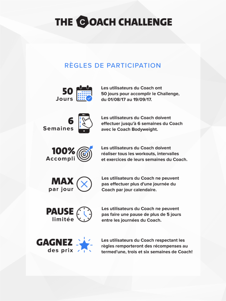Tout d’abord et afin de participer au Challenge, vous devez vous inscrire à la newsletter Freeletics. En plus de recevoir chaque semaine des newsletters et des conseils motivants de la part de votre Coach, un e-mail supplémentaire vous sera envoyé pour chacune des 6 semaines du Challenge effectuée. Vous y trouverez d’importantes informations concernant votre progression dans le Challenge et les détails de vos récompenses. N’oubliez donc pas de consulter votre boîte de réception régulièrement afin d’être tenu(e) au courant. Vous devriez recevoir votre e-mail hebdomadaire le jour suivant la finalisation de votre semaine du Coach. #InItToWinIt.