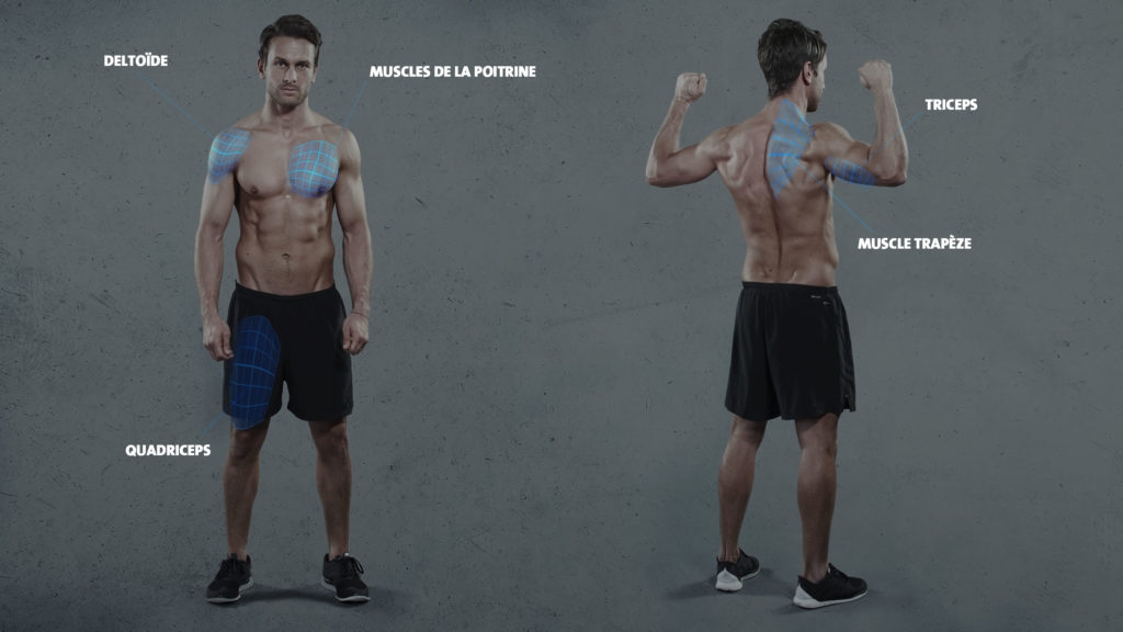 Les burpees travaillent l’ensemble du corps. Les grands groupes musculaires principaux, comme la poitrine, le dos et les muscles des cuisses sont travaillés, ainsi que des petits muscles auxiliaires dans le torse, les épaules et les bras, sont utilisés de façon intensive. Presque toutes les régions du corps sont directement et simultanément sous tension. C’est pourquoi les Burpees sont tellement fatigants – mais aussi tellement efficaces !