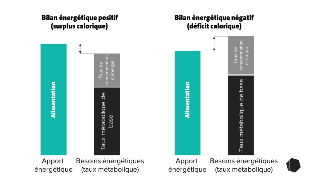 Pour faire simple : si votre apport énergétique journalier est plus important que vos besoins énergétiques journaliers, le bilan énergétique est alors positif et vous prenez du poids. Le surplus d’énergie est stocké dans le corps, principalement sous forme de graisse. Toutefois, si votre apport énergétique journalier est moins important que vos besoins énergétiques journaliers, le bilan énergétique est alors négatif et vous perdez du poids. L’organisme compense le déficit calorique qui en résulte en puisant l’énergie dans les graisses stockées, les muscles ou tout autre réservoir énergétique.