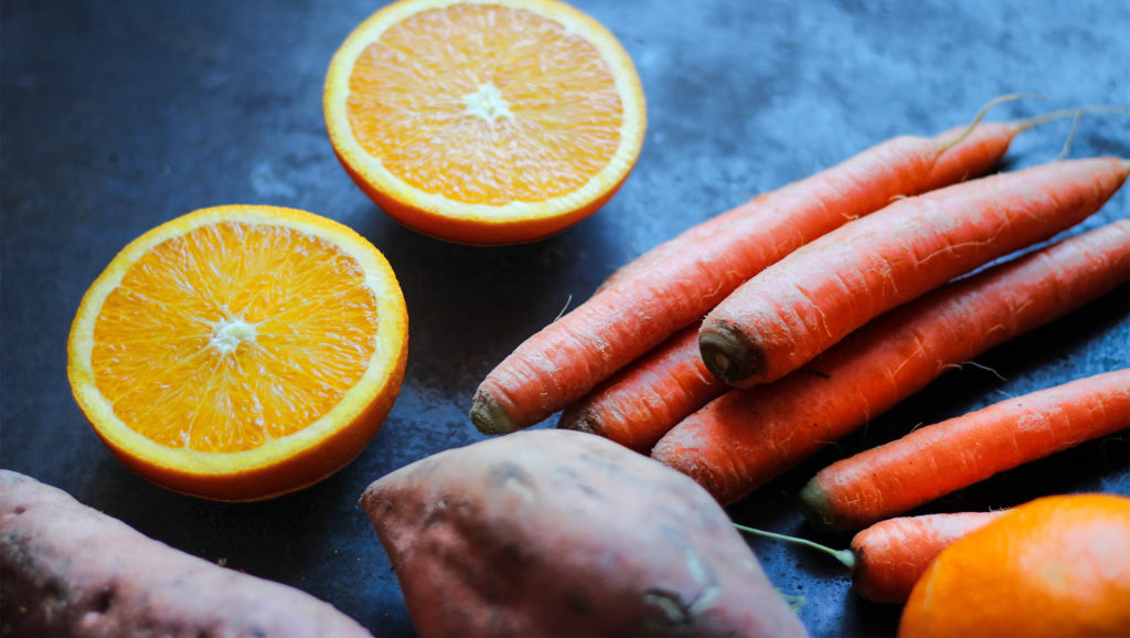 Cibi che colorano il piatto di arancione e di giallo: carote, patate dolci, zucca, cachi, albicocche, limoni, arance, mandarini cinesi