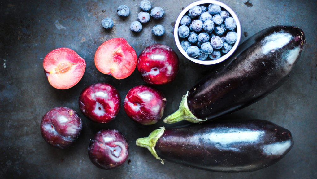 Cibi che colorano il piatto di blu e viola: melanzane, mirtilli, prugne, more, uva nera