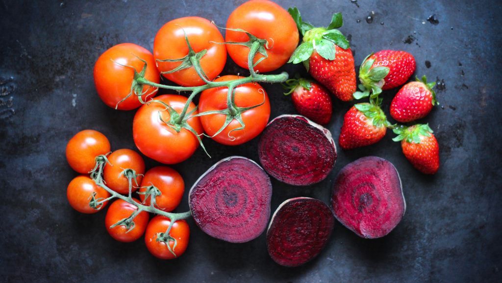 Cibi che colorano il piatto di rosso: pomodori, fragole/lamponi/ciliege, peperoni, peperoncino, cipolle rosse, barbabietole, angurie