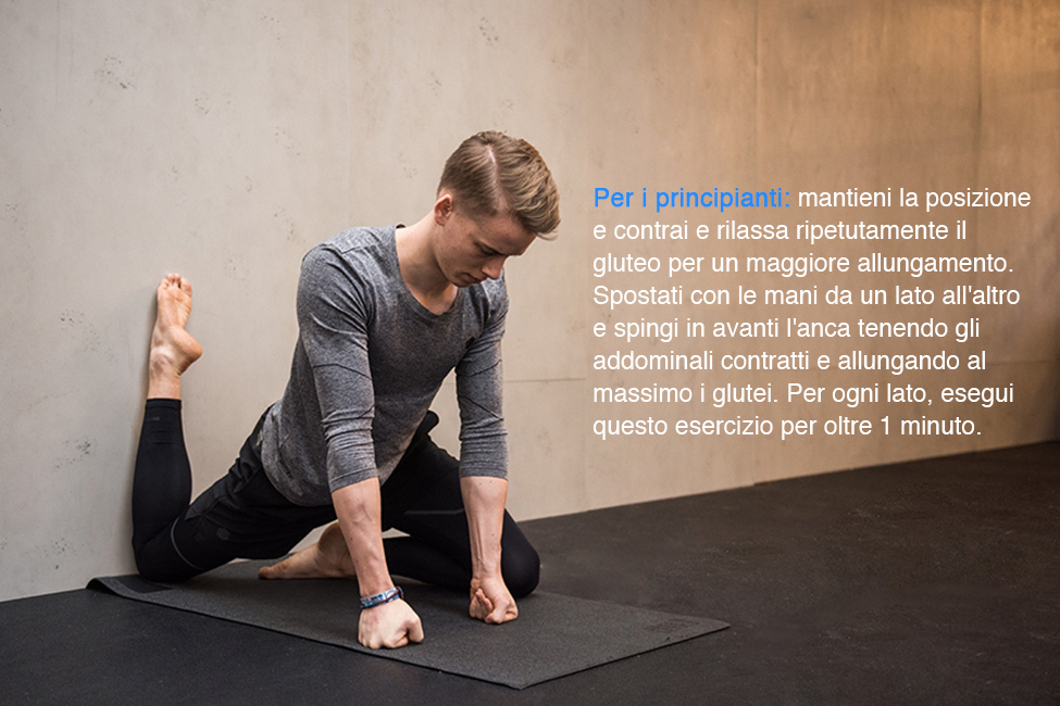 Il cosiddetto Couch-Stretch è probabilmente l’esercizio migliore per aprire la parte anteriore delle anche e sciogliere i muscoli delle cosce. Ti aiuterà a fare gli Squat assumendo una posizione più dritta e corretta e a spingerti ancora di più con le gambe durante gli Sprint. Non preoccuparti se all’inizio farai fatica con questo movimento: se non hai mai fatto questo tipo di allungamento, potrebbe sembrarti come un piccolo workout. Ecco a cosa fare attenzione: Durante questo esercizio è essenziale contrarre il gluteo della gamba posteriore mentre ti metti in posizione e far lavorare gli addominali per mantenere dritta la schiena.
