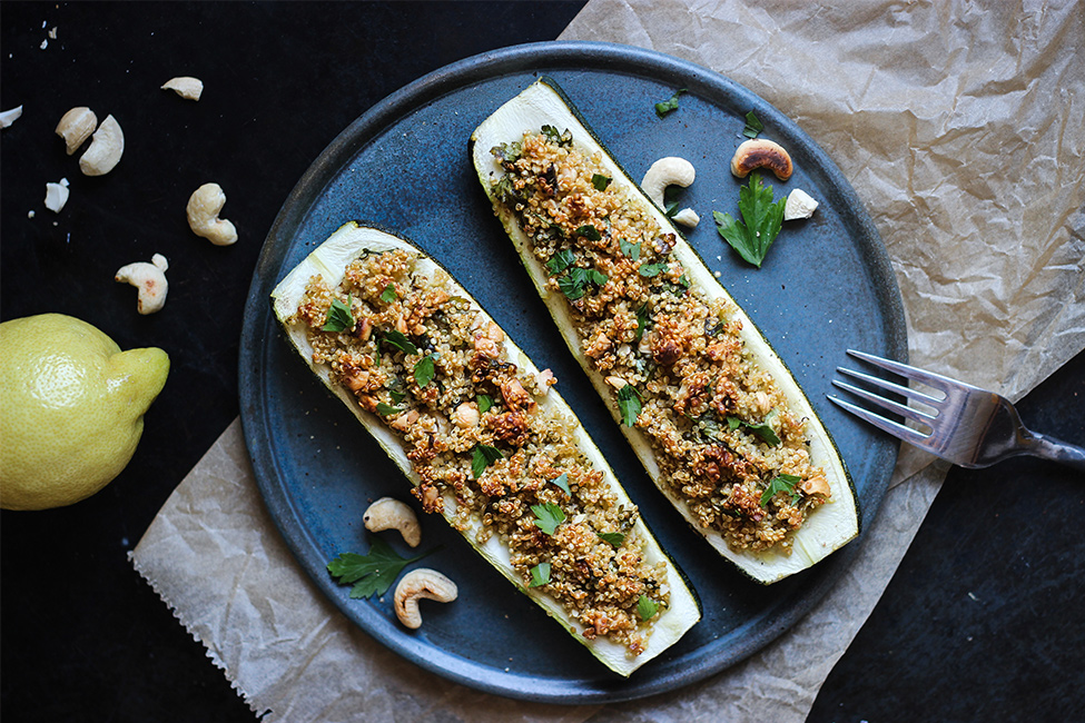 Aqui a abobrinha é escavada em forma de “barco”, e então recheada com quinoa, castanha de caju e um leve toque de suco de limão. O resultado? Uma super refeição saborosa que é tão divertida de fazer quanto deliciosa de comer.