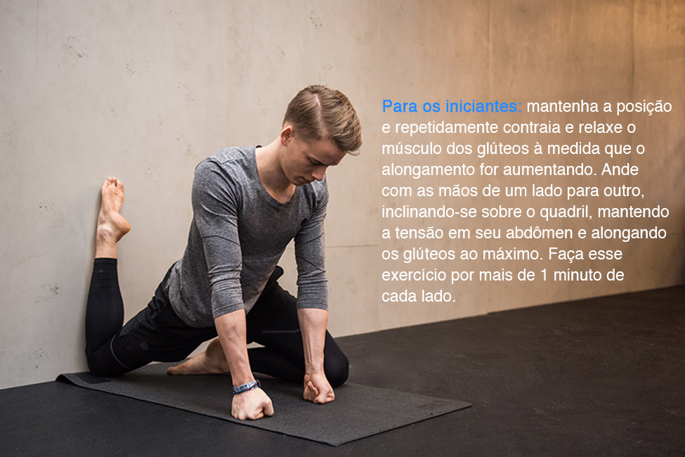 - Para os atletas avançados: para um estímulo diferente, você pode virar o tronco em direção ao seu joelho, abraçar a perna reta de apoio e colocar o seu outro braço (incluindo o seu cotovelo) no chão.
