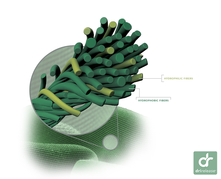 A aplicação de diferentes tipos de fibras assegura o desempenho sustentado do material. O material drirelease® utilizado consiste de uma mistura patenteada de fibras de 85% hidrofóbica (repelente de água) e 15% hidrofílico (absorção de água).